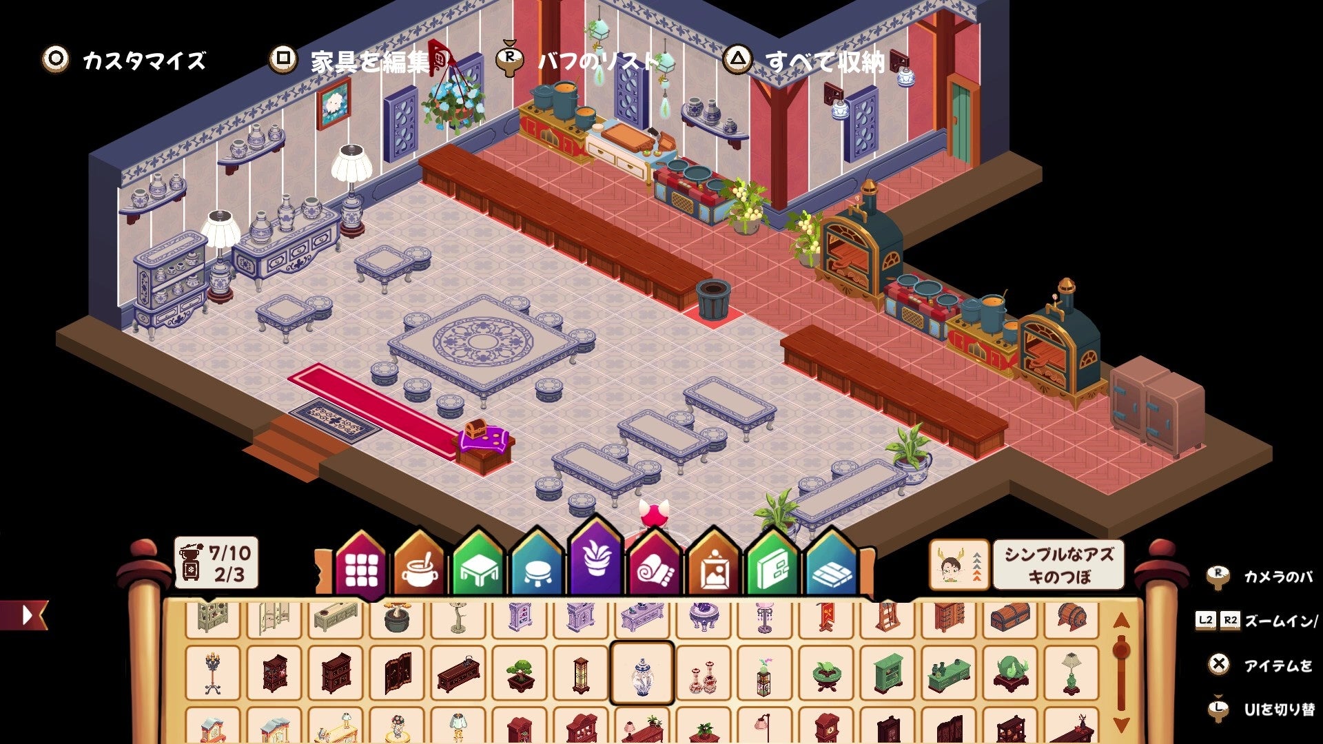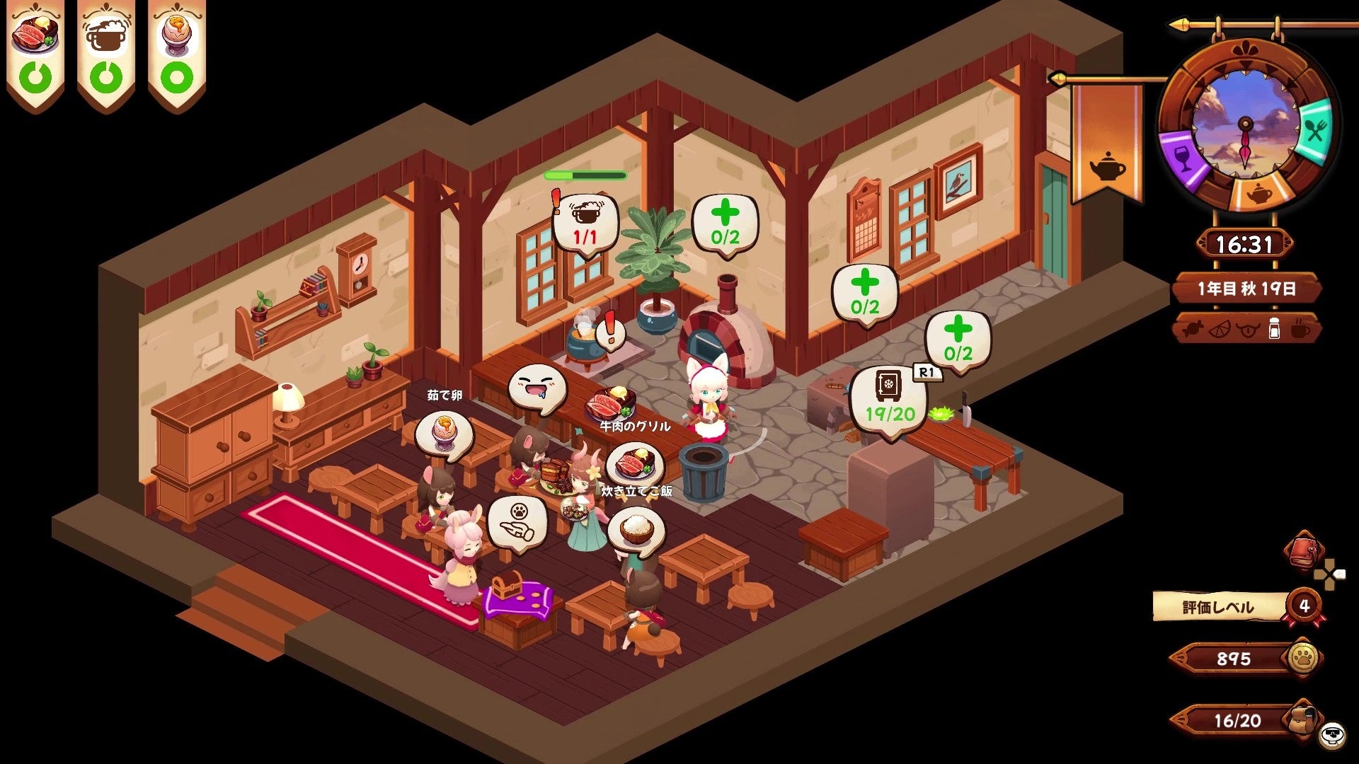 とんかつや寿司、チャーシューメンにハンバーガー、ピザやデザートなど、世界各国の100種類以上の料理を作ってお客さんの注文に応じましょう。町の職人たちの協力を得れば、家具などでキッチンやダイニングホールをカスタマイズできたり、内装を自分好みに模様替えすることもできます。