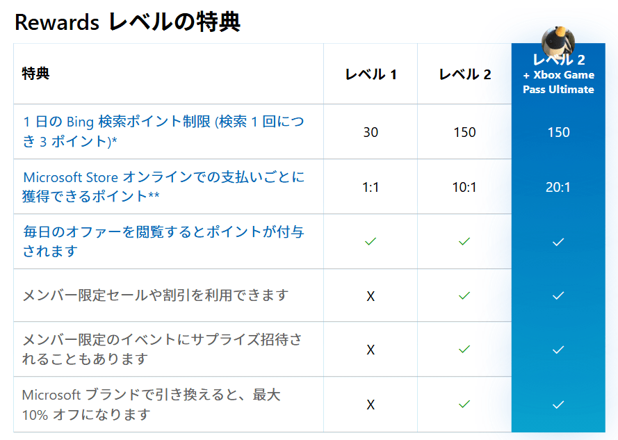 リワードにはもともとXboxへののめり込み具合により特典に差がついていたのだが、このたびこの特典が「Xbox Game Pass Ultimate」の課金者に対して大幅な特典UPが図られることとなった。これは嬉しい。特に嬉しいのはMicrosoft Storeでの支払いごとに獲得できるポイントが20:1とかなり大きくUPしている。嬉しい。いやこれ元からなのかな…?