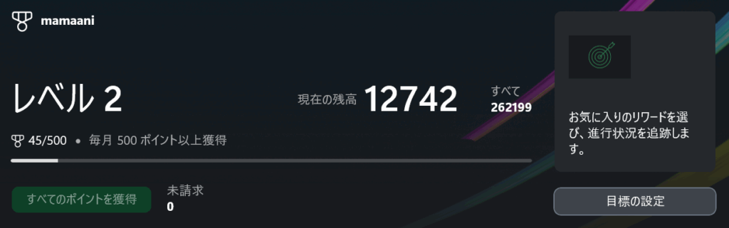 全く興味が無いので本当に申し訳ないだが、XboxアプリからRewardsの項目を開くとこのように表示がされ、進捗状況を確認することができる。